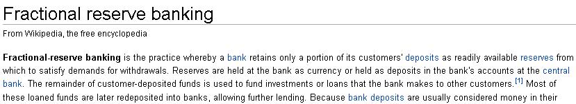 Czyli wg takiego postrzegania systemu bank, kiedy udziela kredytu po prostu „wypożycza depozyty”. Czyli ludzie przynoszą do banku depozyty (nie wiadomo skąd je wzięli, ale to nic), bank dysponuje pulą depozytów, część z puli odkłada na rezerwę obowiązkową, a resztę wypożycza („the remainder of customer-deposited funds is used to fund investment or loans”). Potem w sytuacji katastrofy ludzie przybiegają do banku wypłacić depozyty, a ich nie ma, bo są właśnie wypożyczone. Jest to zasadnicza pomyłka.