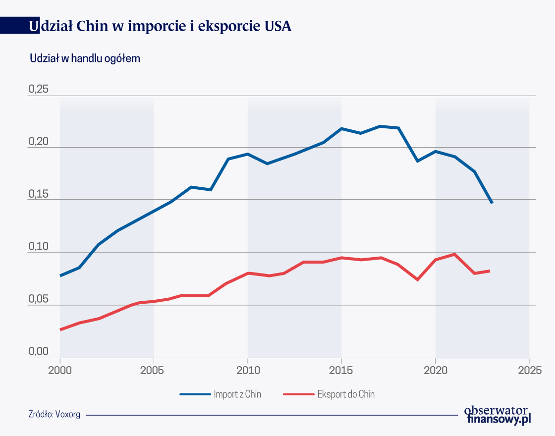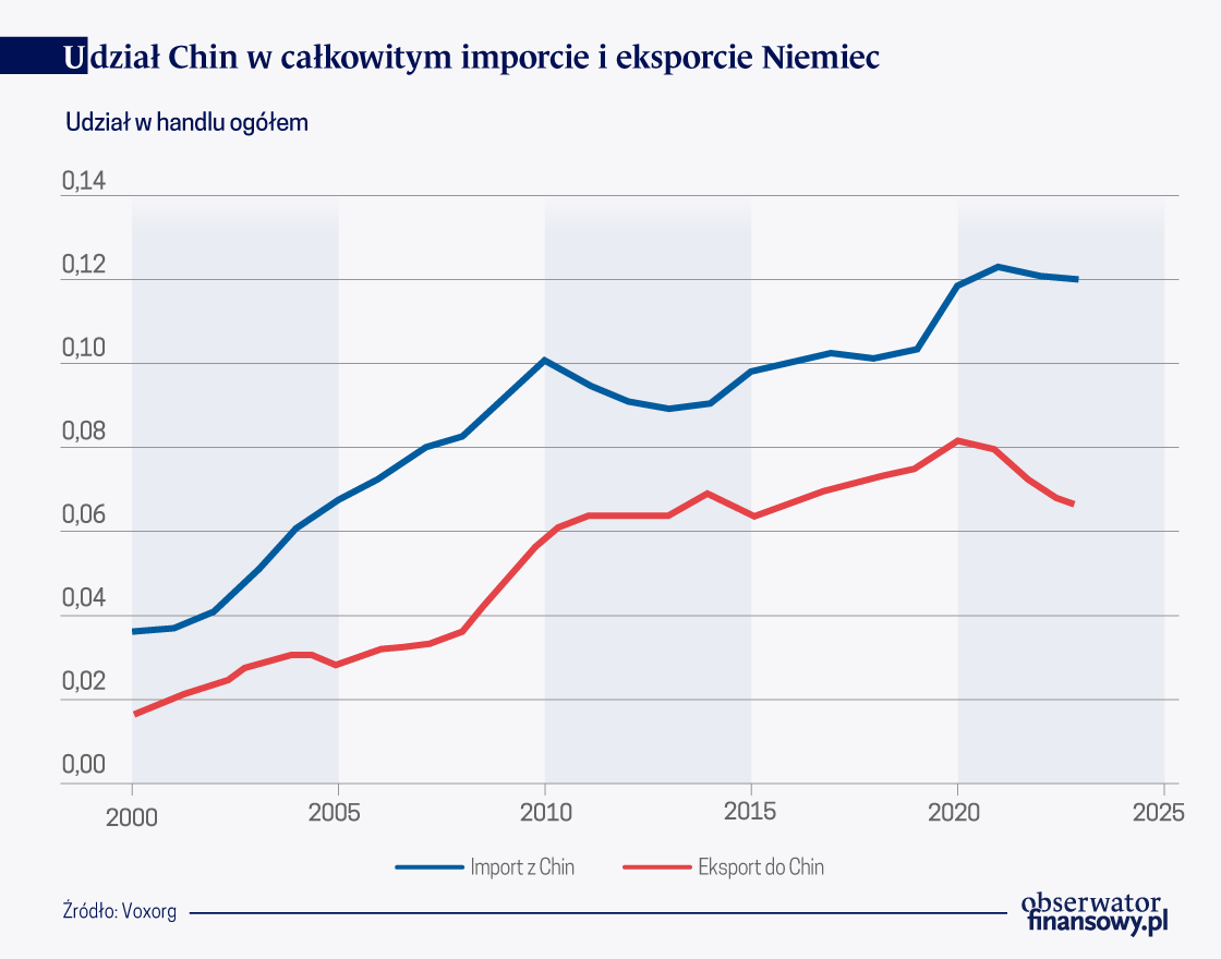 Historyczną zmianę w strukturze handlu Niemiec pokazują dane. W ciągu trzech lat między 2019 r. i 2022 r. udział Chin w niemieckim imporcie wzrósł o 30 proc., z 10 proc. do 13 proc. Eksport do Chin również zmienił się na niekorzyść – udział Chin w całkowitym eksporcie zmalał o 20 proc.
