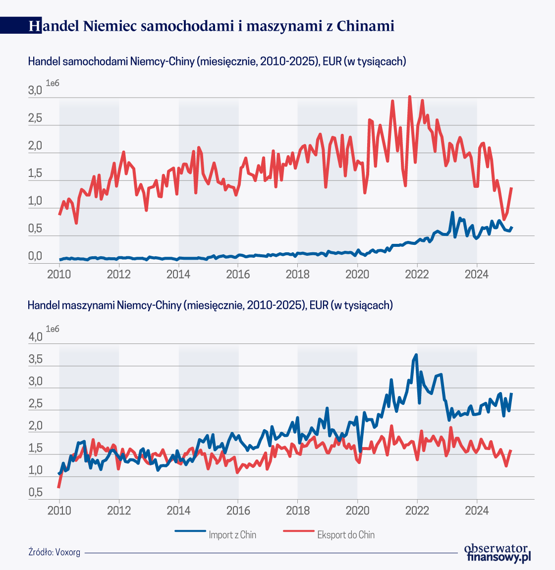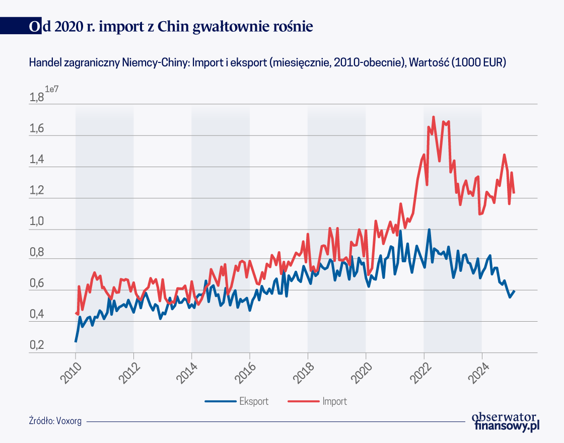 Handel Niemiec z Chinami zmienił gwałtownie oblicze po 2020 roku. Według oficjalnych danych Niemieckiego Urzędu Statystycznego, w latach 2020-2022 import z Chin wzrósł o ponad 60 proc. (wykres poniżej). Pod koniec 2023 r. Niemcy przestały wspierać zakup pojazdów zasilanych baterią krajowymi dotacjami – znanymi jako „dopłaty środowiskowe” – które szczególnie sprzyjały importowi chińskich pojazdów elektrycznych. Ponadto w 2024 r. Komisja Europejska wprowadziła cła w wysokości do 45,3 proc. na import pojazdów elektrycznych z Chin. Bruksela nałożyła również cła na import sprzętu budowlanego w rodzaju podnośników itp. z Chin w wysokości od 20,6 proc. do 66,7 proc. Wprowadzono także cła importowe na szereg produktów chemicznych. Decyzje te przyczyniły się do nagłego załamania importu z Chin w latach 2023-2024.