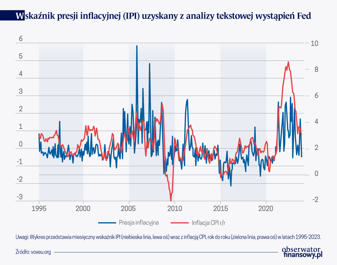 Przeanalizowaliśmy przemówienia FOMC z prawie trzydziestu lat i wykorzystaliśmy analizę tekstową do skonstruowania nowego wskaźnika o nazwie Wskaźnik presji inflacyjnej (IPI), pokazanego na poniższym wykresie. Wskaźnik ten mierzy intensywność, z jaką przedstawiciele Fed mówią o bieżącej lub nadchodzącej inflacji i obliczany jest przy użyciu słownika punktowego składającego się z dodających i odejmujących modyfikatorów, które są stosowane do każdego zdania związanego z inflacją. Nic dziwnego, że wskaźnik IPI zmienia się wraz z poziomem inflacji, jak pokazano na wykresie.
