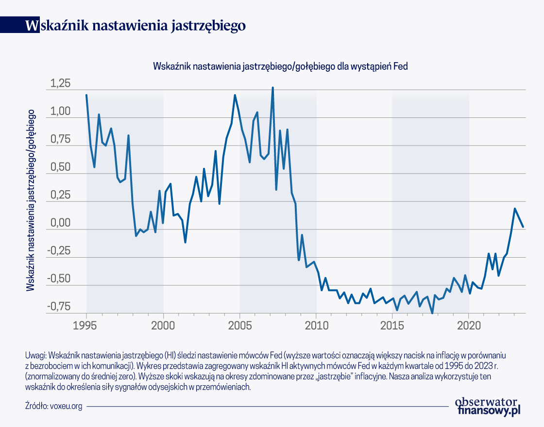 Bankierzy centralni zazwyczaj nie poprzestają jednak na diagnozowaniu inflacji. Często wyjaśniają również, w jaki sposób zamierzają zareagować. Nasze badanie pokazuje, że kluczowym aspektem jest to, czy publiczność pozytywnie odbiera odysejską tonację przemówienia Fed. Aby zmierzyć odysejską tonację przemówień, wykorzystujemy analizę tekstową do skonstruowania drugiego nowego wskaźnika o nazwie Hawkishness Index (HI) (wskaźnik nastawienia jastrzębiego), pokazanego na wykresie poniżej. Wskaźnik ten mierzy tendencję każdego mówcy do podkreślania inflacji (promowanie stabilności cen) w stosunku do bezrobocia (promowanie wzrostu). Wyższa wartość wskazuje na bardziej „jastrzębiego” mówcę – takiego, który ma silniejsze nastawienie antyinflacyjne lub, w praktyce, gotowość do podniesienia stóp procentowych w celu walki z inflacją (jak w Hack i in. 2023). Następnie zbadamy, co się dzieje, gdy wysoka presja inflacyjna jest komunikowana w środowisku, w którym ogólny poziom jastrzębiej postawy wśród aktywnie wypowiadających się urzędników Fed jest również wysoki. Zasadniczo ta kombinacja powinna wzmocnić odysejską orientację przemówień Fed w tym okresie: inflacja rośnie, a Fed prawdopodobnie zareaguje agresywnie.