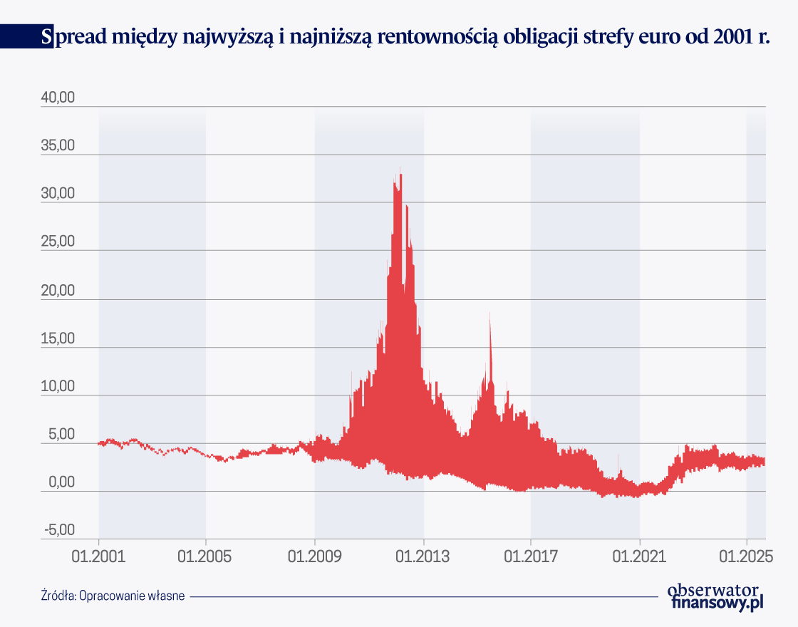 Aktualnie najwyższą rentowność w sektorze 10Y obligacji spośród krajów południa Europy mają obligacje Włoch. Różnica między najwyższą a najniższą rentownością obligacji 10Y wśród państw strefy euro (różnica między 10-latkami Włoch i Niemiec) wyniosła 1 września 2025 r. 87 pb. – był to najniższy poziom od 2008 r., który wskazuje na utrzymywanie się wysokiego stopnia konwergencji między krajami w strefie euro (wykres poniżej).
