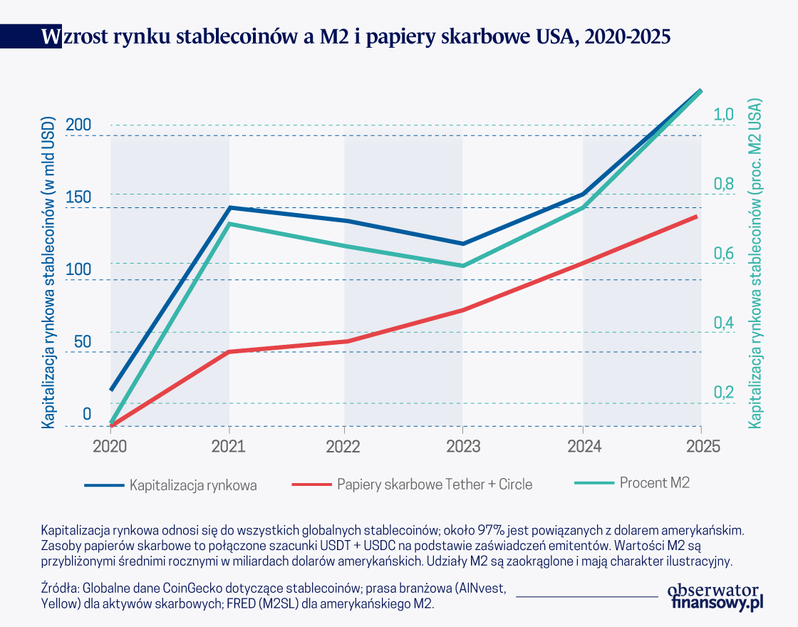 Cel takiej strategii jest jasny. Sekretarz skarbu Scott Bessent przewiduje, że wartość rynku stablecoinów – aktualnie około 250 miliardów dolarów – może urosnąć do 2 bilionów dolarów w 2028 r., znacznie zwiększając globalny obrót dolarem. Już teraz emitenci stablecoinów zgromadzili dolarowe bony skarbowe wartości ponad 140 miliardów dolarów, co sprawia, że w ich rękach jest łącznie większa kwota amerykańskiego długu niż w posiadaniu Niemiec (Ahmed i Aldasoro 2025).