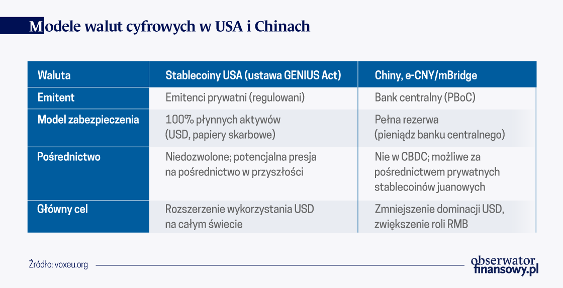 Strategia USA w ramach ustawy GENIUS opiera się na prywatnie emitowanych, w pełni zabezpieczonych stablecoinach dolarowych, podczas gdy podejście Chin opiera się na e-CNY — cyfrowej walucie banku centralnego (CBDC), wdrażanej na rynku krajowym i rozszerzanej poza granice za pośrednictwem mBridge.