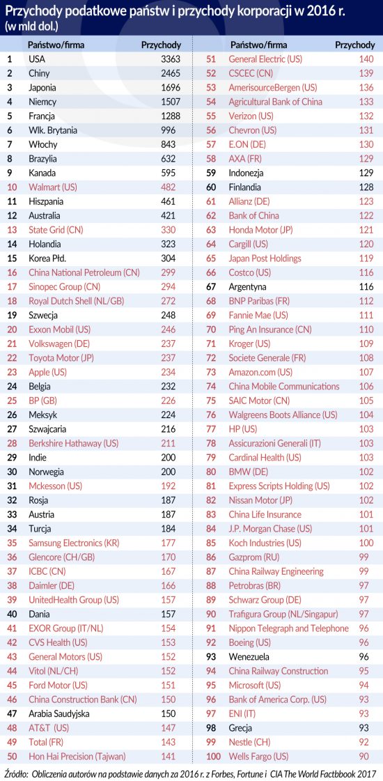 Według statystyk publikowanych przez ministerstwo finansów w portalu danepubliczne.gov.pl, dochody sektora rządowego i samorządowego wyniosły w 2016 r. 719,2 mld zł, z czego 380, 8 mln stanowiły składki emerytalno-rentowe, zdrowotne i pozostałe. W ujęciu prezentowanym w zestawieniu państw i korporacji dla Polski powinno się uwzględnić „czyste” podatki, czyli 338, 4 mld zł, co po przeliczeniu wg średniorocznego kursu dolara (3,94 zł wg NBP) daje 85,9 mld dolarów. Taki wynik usuwa nas poza nawias zestawienia.