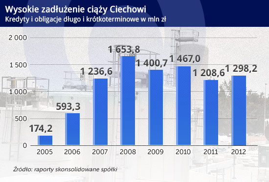 Zadłużenie Ciechu w bankach i na rynku papierów dłużnych rosło od połowy ubiegłej dekady. Jeszcze w końcu 2005 roku zadłużenie długo- i krótkoterminowe spółki wynosiło nieco ponad 174 mln zł. W końcu 2008 roku osiągnęło poziom 1 mld 654 mln zł. Od tego momentu firma nieco zmniejszyła zadłużenie i na koniec 2012 roku miała prawie 1,3 mld zł długu.
