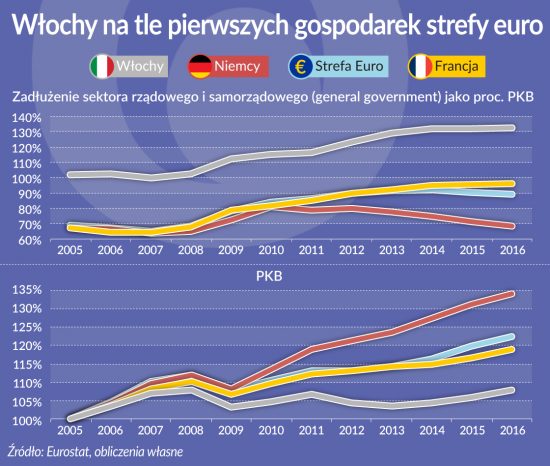 Od polowy ubiegłej dekady włoskie PKB wzrosło zaledwie o 8 proc. i jest obecnie na tym samym poziomie, na jakim było przed wybuchem kryzysu finansowego w 2008 r. Gospodarka całej strefy euro urosła w tym czasie o 22 proc., a Niemiec aż o 34 proc. Nawet borykająca się z licznymi problemami Francja od 2005 r. zanotowała wzrost PKB o jedną piątą.