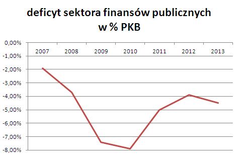 Zwiększenia deficytu o 16 mld PLN, czyli o 1 punkt procentowy polskiego PKB (zaplanowanego na 2013 na 1643 mld PLN, chociaż będzie zapewne bliżej 1620 mld PLN) oznacza, że deficyt sektora finansów publicznych w tym roku sięgnie 4,5% PKB. Czy to dużo ? Dośc sporo, ale bez przesady – daleko nam do dwucyfrowych rekordów w strefie euro i do sytuacji polskich finansów publicznych z lat 2009-2010.