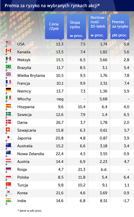 Innym sposobem oceny atrakcyjności wycen akcji jest odniesienie ich do bezpiecznych form inwestowania. Najczęściej bazuje się w takim wypadku na rentowności 10-letnich obligacji. Rzeczywiście, przy takim podejściu akcje stanowią bezkonkurencyjną propozycję. Stopa zysku, czyli odwrotność wskaźnika cena/zysk, odzwierciedlająca długoterminową dochodowość akcji znacząco przewyższa zyskowność 10-letnich obligacji. W USA o 5,8 pkt proc., w Kanadzie o 5,6 pkt proc., w Wielkiej Brytanii o aż 7,8 pkt proc. Najmniej atrakcyjnie ta relacja prezentuje się w Indiach (z uwagi na wysoką inflację rentowność 10-latek sięga tam 8,5 proc. przez co jest wyższa od stopy zysku z akcji), w Korei i Nowej Zelandii, a w naszej części świata w Turcji.