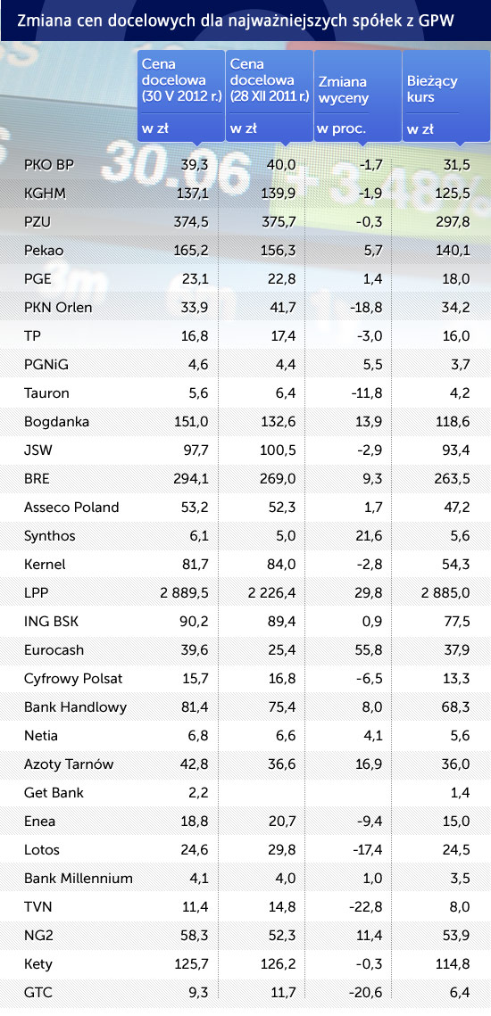Typowym zachowaniem analityków wyceniających spółki giełdowe jest to, że w miarę poprawy uwarunkowań gospodarczych i wzrostu współczynników wycen na giełdach podnoszą ceny docelowe dla ocenianych spółek. Analitycy najczęściej bazują przy wycenach na metodzie porównawczej (polega na ocenie atrakcyjności firmy na tle współczynników wyceny porównywalnych przedsiębiorstw) oraz zdyskontowanych przepływów pieniężnych (prognozowane dochody przedsiębiorstwa przeliczane są na ich bieżącą wartość). W przypadku największych firm z warszawskiego parkietu nie widać w ostatnich miesiącach sukcesywnego wzrostu ich wartości fundamentalnej, wynikającej z metodologii przyjmowanej przez analityków.