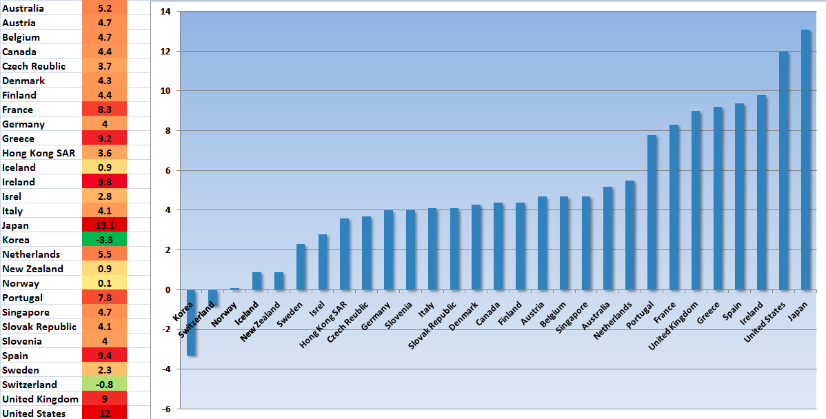 Infectious Greed przedstawia za MFW wielkość długu wewnętrznego poszczególnych krajów świata. I skalę koniecznej redukcji wydatków lub zwiększenia podatków, jeśli zdecydowałyby się na którąś z reform.
