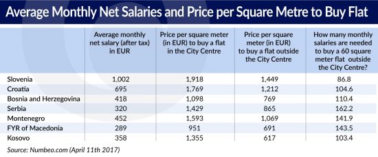 Although real estate prices in Slovenia are the highest among all former Yugoslav republics the citizens of Slovenia need the shortest time spent at work to afford a 60 square meter flat outside the city center: it is a cost of 86.8 average monthly salaries. If we assume that an average Slovene spends half of his salary, then he will need 173.6 months (14.5 years) to buy a flat.