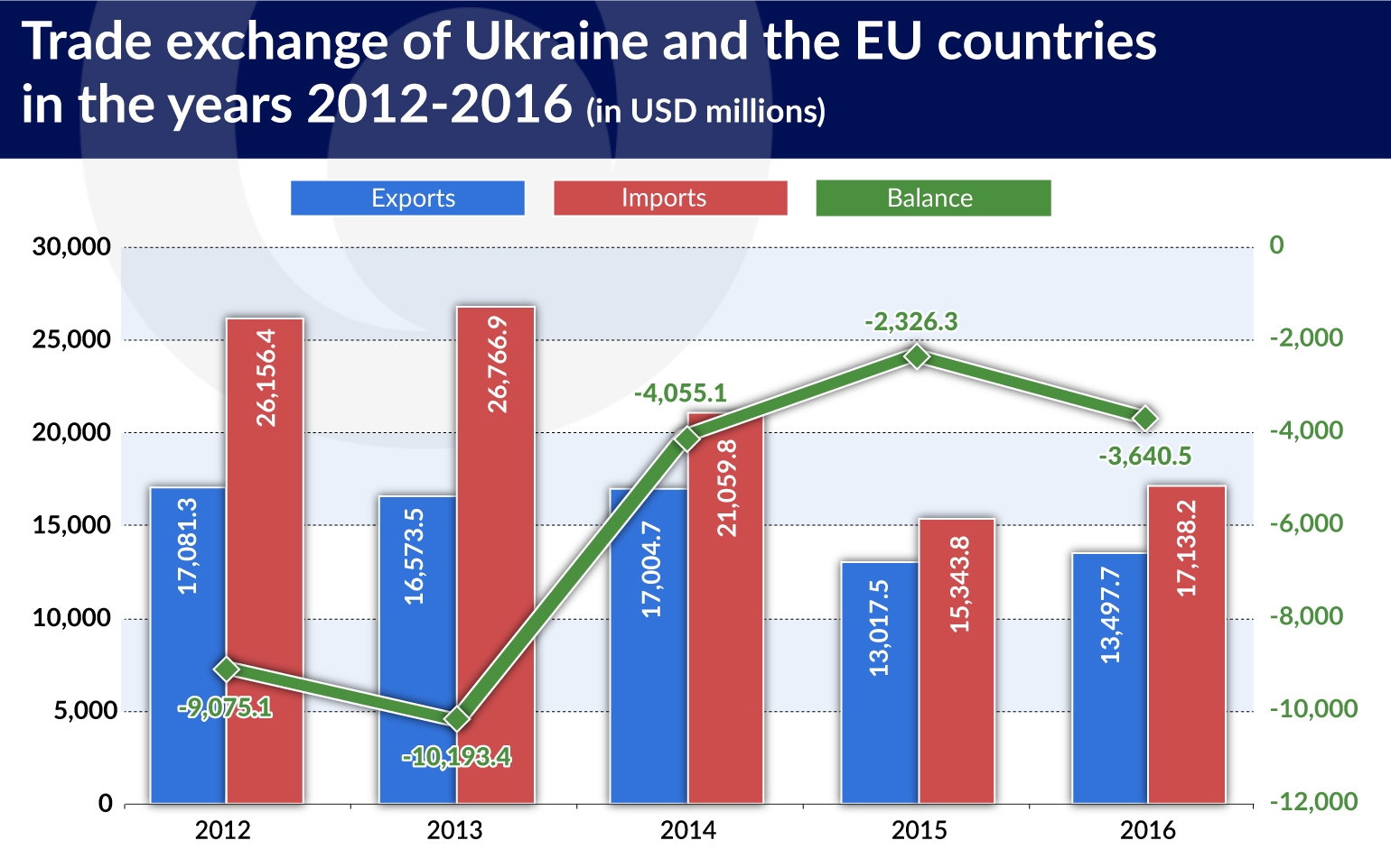 According to the State Statistics Service of Ukraine in 2016 the exports of Ukrainian goods to the EU Member States amounted to almost USD13.5bn and were almost USD0.5bn higher than a year before. At the same time the imports increased from USD15.3bn in 2015 to USD17.1bn.