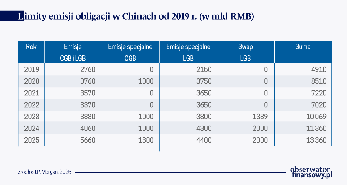 W kontekście polityki fiskalnej, która stanowiła najważniejszy element oczekiwań rynków finansowych, chiński rząd w listopadzie 2024 r. ogłosił, że zwiększa o 1,4 bln dol. dług rządowy, który miał złagodzić obciążenia finansowe lokalnych samorządów. W ramach tego dostosowania utworzono dwa programy, w ramach których: i) środki w wysokości 853 mld dol. mają zostać przeznaczone na spłatę długów zaciągniętych w ramach emisji lokalnych instrumentów finansowania samorządów przez okres najbliższych 3 lat; ii) środki w wysokości 547 mld dol. mają posłużyć na spłatę „ukrytych długów” (ang. hidden debts) w okresie najbliższych pięciu lat. Ponadto w marcu 2025 r. władze w Pekinie poinformowały, że podwyższyły do 4 proc. PKB deficyt budżetowy na 2025 r. (jeśli ten cel zostanie osiągnięty to będzie najwyższy deficyt od 2010 r.) i planują wyemitować 1,3 bln renminbi w formie ultradługoterminowych specjalnych obligacji skarbowych, w porównaniu z 1 bln renminbi wyemitowanym w 2024 r.