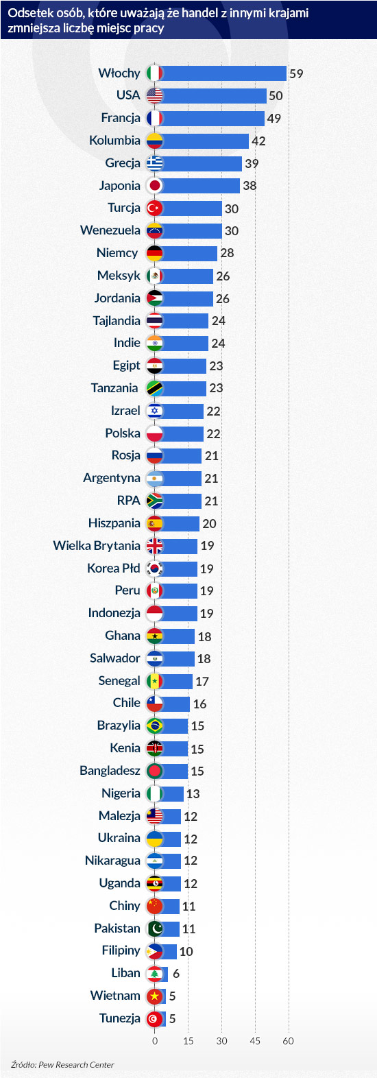 Do największych entuzjastów handlu międzynarodowego należą Tunezyjczycy (87 proc. sądzi, że tworzy on miejsca pracy, 5 proc. że nie), Wietnamczycy (78 proc. do 5 proc.) i Libańczycy (75 proc. do 6 proc.). Polakom bliżej do entuzjastów niż sceptyków (51 proc. do 22 proc.). Podobne jak w Polsce opinie są w Egipcie (49 proc. do 23 proc.) i Indiach (49 proc. do 24 proc.).
