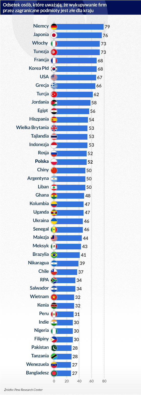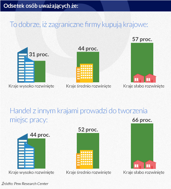 Z kolei najwięcej entuzjastów sprzedawania lokalnych firm zagranicznym właścicielom jest w Bangladeszu (27 proc. sądzi, że to coś złego, a przeciwnego zdania jest 69 proc.), Tanzanii (28 proc. i 68 proc.) i Kenii (32 proc. i 66 proc.). Wyłania się wyraźna zależność: im wyżej rozwinięty kraj, tym mniejsze poparcie dla kupowania krajowych przedsiębiorstw przez zagranicznych inwestorów. Polska jest pod tym względem w środku stawki: 52 proc. Polaków uważa, że to źle, iż zagraniczne firmy wykupują polskie. Przeciwnego zdania jest 40 proc.