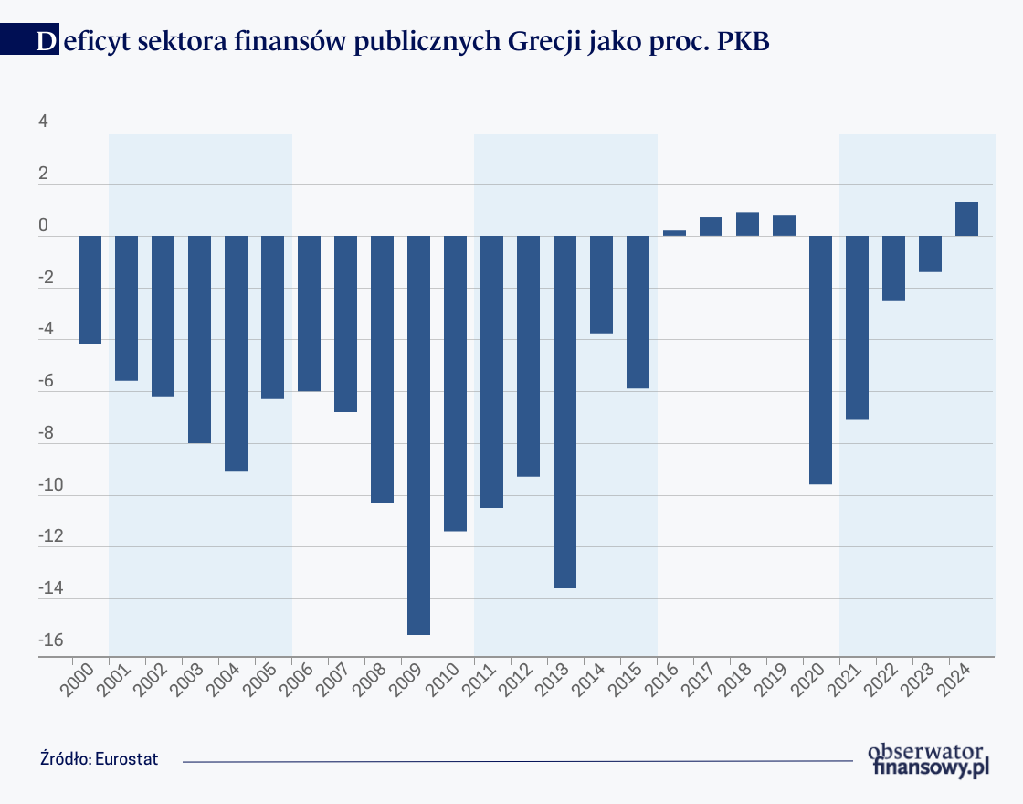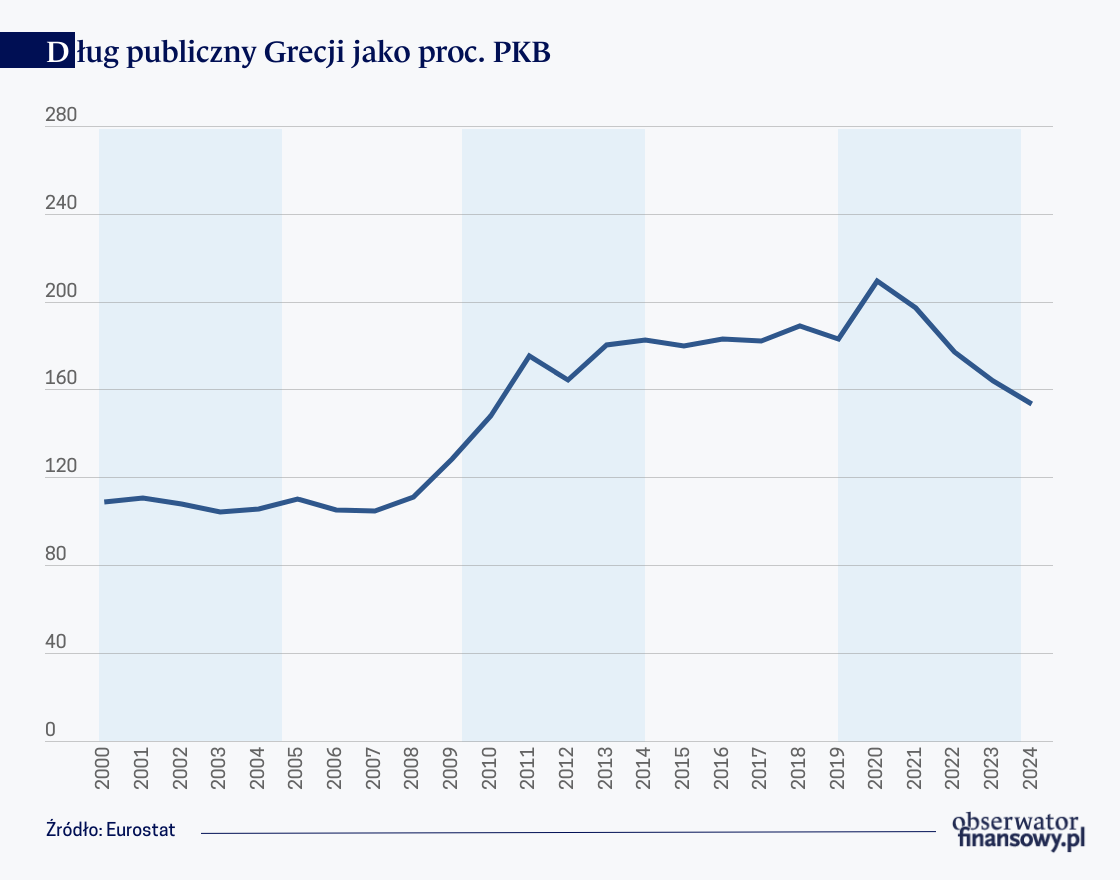 Grecja nadal pozostaje państwem o bardzo wysokim zadłużeniu, w 2024 r. przekraczało ono 150 proc. PKB. Mieszkańcom tego kraju doskwierają wciąż wysokie koszty obsługi wcześniej zaciągniętych zobowiązań. Jak pokazują dane Eurostatu i Komisji Europejskiej, w 2024 r. było to 3,5 proc. PKB, czyli drugi najwyższy wynik w całej Unii Europejskiej; gdyby nie to, nadwyżka budżetowa Grecji wyniosłaby 4,8 proc. zamiast 1,3 proc. PKB. Nadwyżka pierwotna (czyli przed uwzględnieniem odsetek) na poziomie niemal 5 proc. PKB musi robić wrażenie. Wysokie odsetki są oczywiście skutkiem zaciągniętego w przeszłości gigantycznego zadłużenia. Chociaż Grecja ma coraz lepszą sytuację fiskalną, musi jednak spłacać to, co kiedyś pożyczyła. Problem ma zatem swoje źródła lata wstecz.