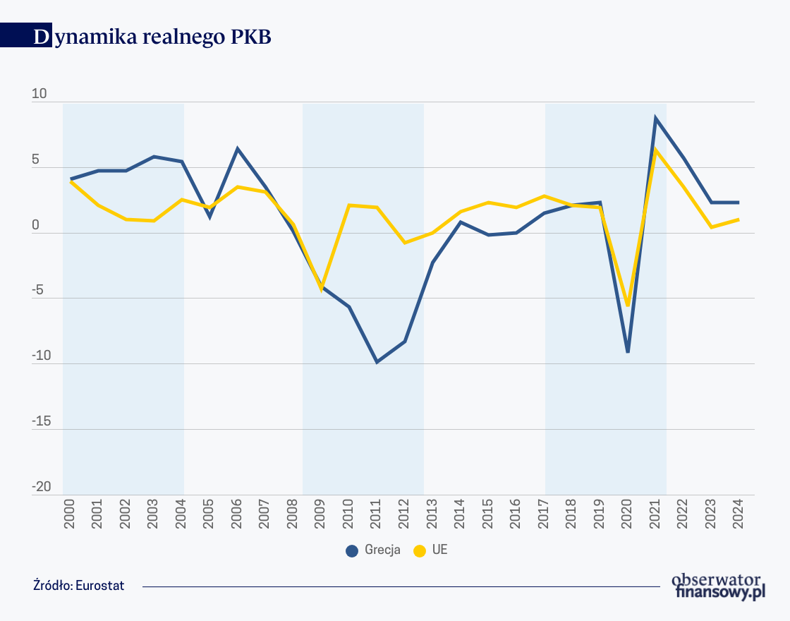 Grecy wyciągnęli wnioski ze swoich błędów i zaczęli prowadzić inną politykę fiskalną. Widać to po danych, które zarówno po stronie dochodowej jak i wydatkowej wyglądają znacznie lepiej. Jak wynika z danych Eurostatu, w 2007 r., czyli przed wybuchem światowego kryzysu finansowego dochody państwa stanowiły 34 proc. PKB. Dla porównania średnia unijna wynosiła wówczas 40,1 proc. Dane za 2023 r. pokazują jednak już coś zupełnie innego. Do greckiego budżetu i systemu ubezpieczeń społecznych trafiło 40,7 proc. tamtejszego PKB, nawet trochę więcej niż unijna średnia. Zaczęła się także poprawiać sytuacja sektora finansów publicznych. Zaczął on odnotowywać nadwyżki już w latach 2016–2019, potem w okresie pandemii COVID-19, wróciły duże deficyty, nie była to jednak tylko grecka specyfika. W 2024 r. sektor general government znowu wyszedł na plus – i to wyraźnie. Znacznie lepiej było także jeśli chodzi o wzrost gospodarczy. Ostatni raz był on ujemny w 2015 r., nie licząc oczywiście pandemicznego 2020 r. W ostatnich latach greckie PKB rośnie wyraźnie szybciej od średniej unijnej. To sprzyja finansom publicznym, popularna miara zadłużenia odnosi się bowiem do coraz większego PKB, a zatem wartość wskaźnika jest mniejsza.