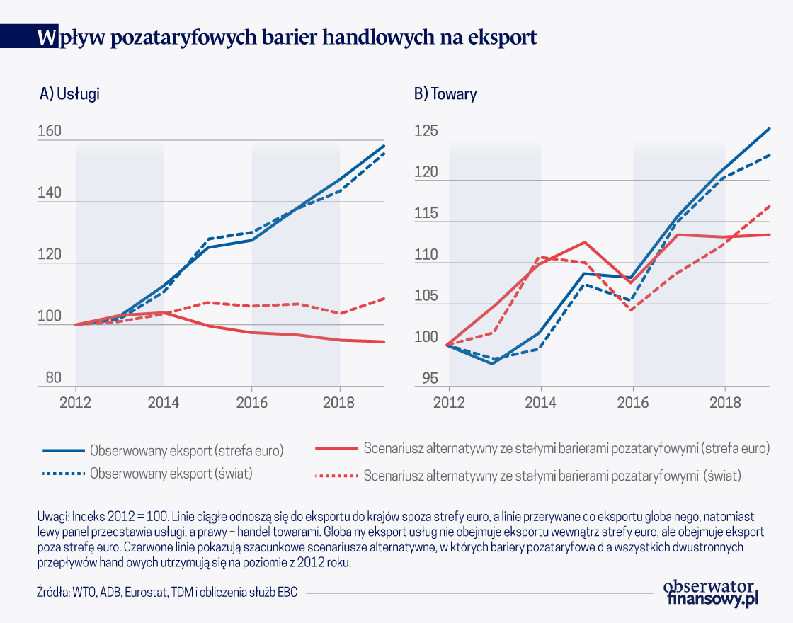 Wyniki sugerują, że zmniejszenie barier pozataryfowych może tłumaczyć wzrost handlu usługami. W scenariuszu alternatywnym, w którym bariery pozataryfowe we wszystkich dwustronnych przepływach handlowych pozostałyby na poziomie z 2012 r., eksport usług uległby stagnacji, zarówno w strefie euro, jak i na całym świecie (wykres poniżej). Wyniki te są przede wszystkim konsekwencją zmian w szacowanym wpływie odległości, a nie zmieniającego się wpływu granic  międzynarodowych. Ustalenia te są zgodne z poglądem, że postęp technologiczny umożliwił wzrost udziału usług świadczonych i konsumowanych w miejscu innym niż miejsce ich pochodzenia, dzięki czemu można nimi łatwiej handlować w przestrzeni geograficznej. Z kolei większości długookresowego trendu w eksporcie towarów produkcyjnych nie można wyjaśnić zmianami w barierach pozataryfowych (wykres poniżej).