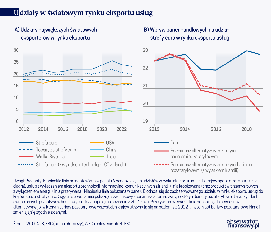 Perspektywicznie, faktycznie istnieją wyzwania dla konkurencyjności strefy euro w handlu usługami. Wydaje się, że strefa euro korzysta ze spadku barier pozataryfowych w handlu usługami, ale jej działalność innowacyjna w najszybciej rozwijających się sektorach nie nadąża za konkurencją międzynarodową. Według unijnej tablicy wyników inwestycji przemysłowych w badania i rozwój z 2024 r., w 2023 r. firmy z USA odpowiadały za 70 proc. globalnych wydatków na badania i rozwój w obszarze ICT w sektorze przedsiębiorstw, natomiast udział firm ze strefy euro wynosił zaledwie 7 proc. W zakresie usług telekomunikacyjnych strefa euro osiągnęła lepsze wyniki niż USA, ale ma duże opóźnienie w zakresie usług komputerowych i oprogramowania. To opóźnienie w dziedzinie innowacji może odzwierciedlać zależność od technologii dostawców zagranicznych, które są niezbędne do cyfryzacji gospodarki. W przyszłości zniwelowanie luki w wydatkach na badania i rozwój oraz wspieranie innowacji będzie miało kluczowe znaczenie dla strefy euro, aby uniknąć strategicznej zależności i utrzymać konkurencyjność, wykorzystując globalne przesunięcie w kierunku handlu usługami i obracając postępy w technologiach cyfrowych na swoją korzyść.
