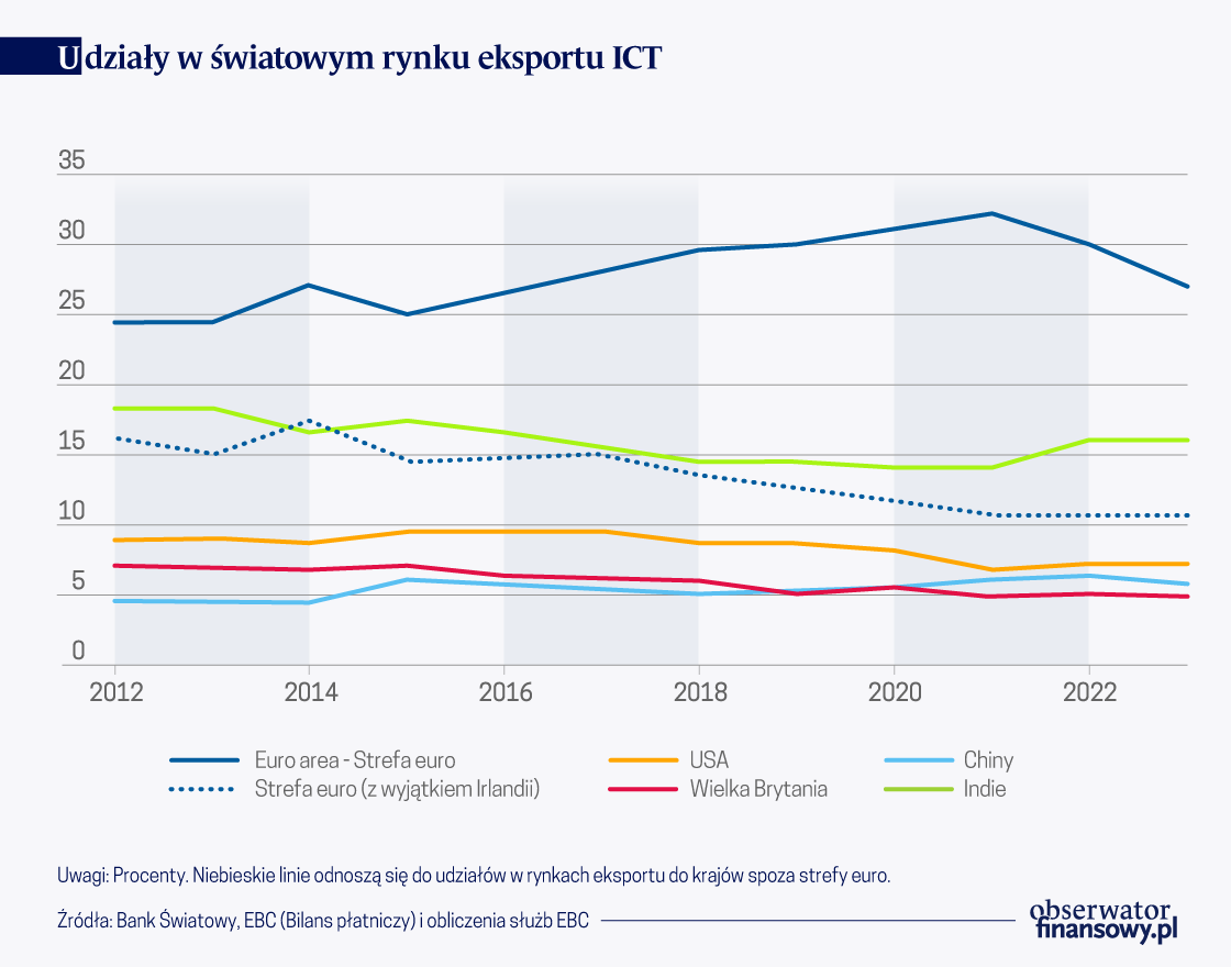 Wielu ekonomistów i decydentów wyraziło obawy, że Europa nie będzie w stanie wykorzystać rosnącego globalnego popytu na technologie cyfrowe, podkreślając lukę w produktywności w porównaniu z konkurencją międzynarodową (zob. na przykład Caffarra i Lane 2024, Draghi 2024 i Schnabel 2024). Taka luka dopiero w ostatnich latach zaczęła być widoczna w danych dotyczących globalnego eksportu usług w zakresie technologii informacyjno-komunikacyjnych (ICT). Strefa euro jest światowym liderem w dziedzinie usług ICT i jeszcze bardziej zwiększyła swój udział w światowym rynku eksportu, zanim zaczęła tracić przewagę na rzecz konkurencji międzynarodowej w latach 2022 i 2023, czyli w najnowszych punktach danych (wykres poniżej).