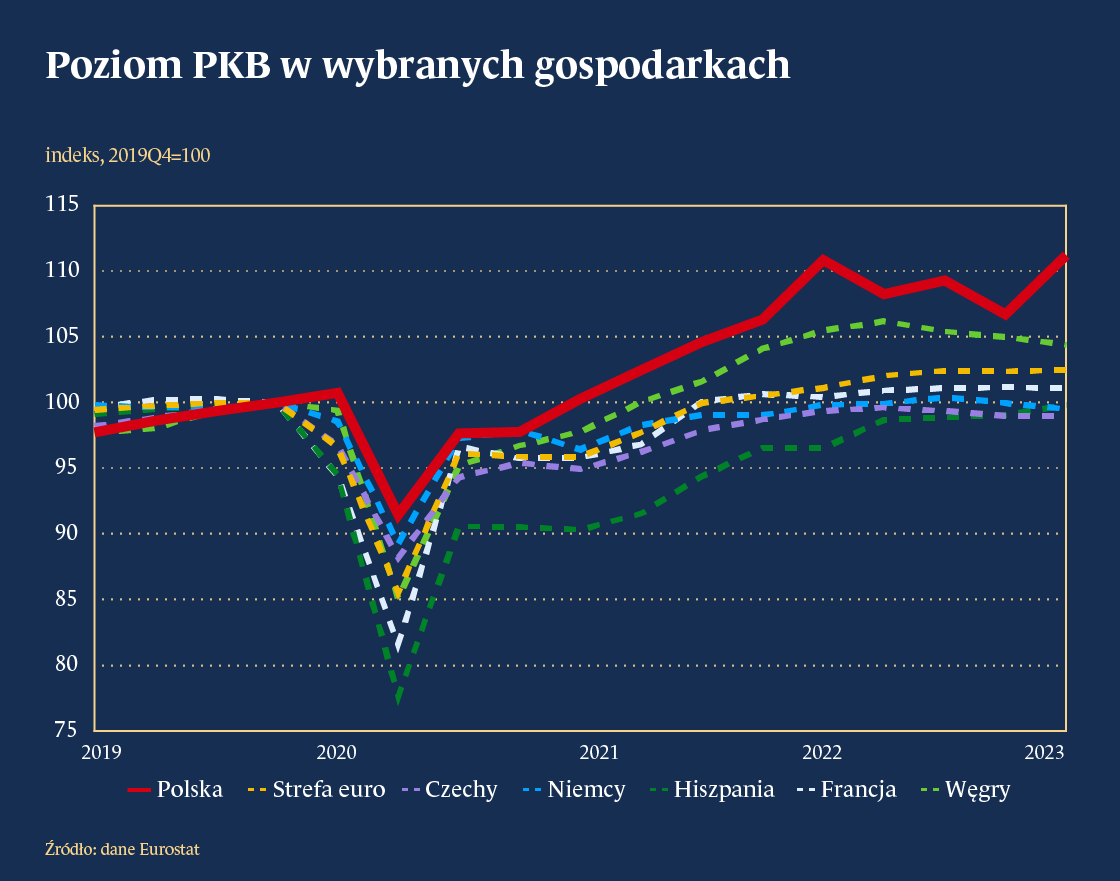 Pomimo to stopa wzrostu PKB Polski w najbliższych latach będzie wyższa niż średnio w UE. Oczekuje się, że utrzyma ona dynamikę powyżej średniej unijnej.