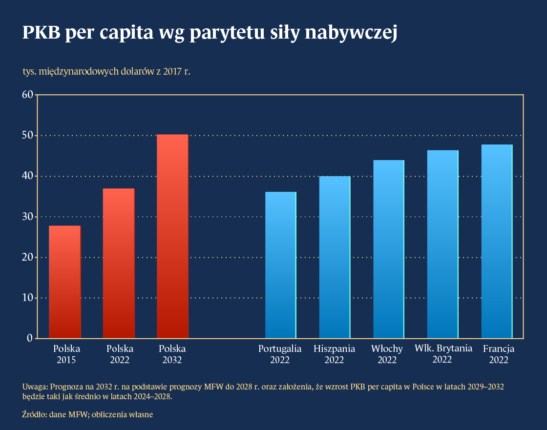 Biorąc pod uwagę tempo wzrostu gospodarczego Polski w ostatnich latach oraz wciąż dużą przestrzeń do konwergencji w sektorach takich jak technologie informacyjne, energia odnawialna i przemysł 4.0, przewidywania te wydają się być realistyczne. Stosując takie same założenia dla wybranych krajów Unii Europejskiej jak były zastosowane dla Polski można dojść do wniosku, że już w 2032 r. Polska mając PKB per capita (PSN) na poziomie 49,7 tys. dol. wyprzedzi Włochy (48,6) i Hiszpanię (45,9) oraz będzie na zbliżonym poziomie z Wielką Brytanią (51,7).