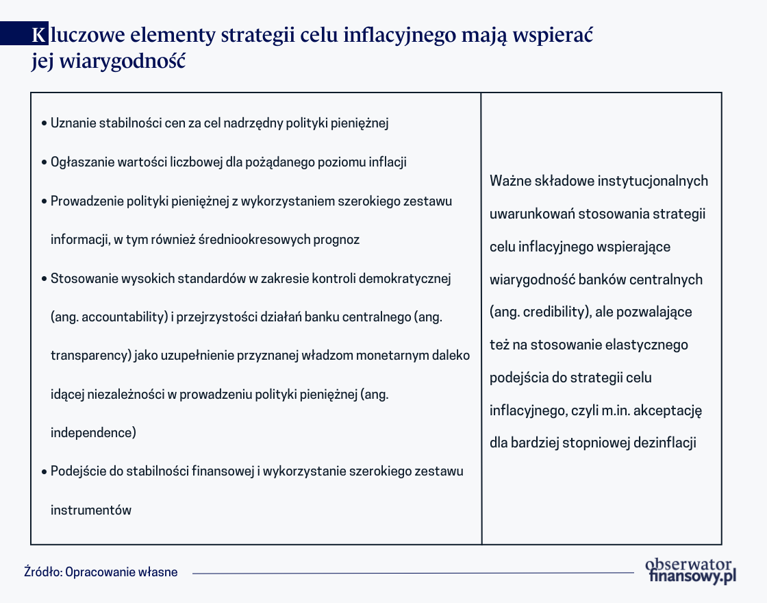 Łącznie wymienione elementy składają się na instytucjonalne uwarunkowania działań banków centralnych. Ich znaczenie wynika z faktu, że uwarunkowania te mogą ograniczać dyskrecjonalność polityki pieniężnej, a przez to potencjalnie wzmacniają wiarygodność władz monetarnych. To ważne, gdyż banki centralne wykorzystujące strategię celu inflacyjnego – co do zasady – stosują dość elastyczne podejście do polityki pieniężnej. Oznacza to, że decydując np. o tempie i skali zacieśnienia uwzględniają także skutki tych decyzji dla sfery realnej gospodarki. W praktyce władze monetarne mogą zatem uznać za właściwe bardziej stopniowe przywracanie inflacji do celu. Aby takie zachowanie – raczej dyskrecjonalne – nie spowodowało utraty zaufania do kotwicy nominalnej, znaczenie ma właśnie wiarygodność.