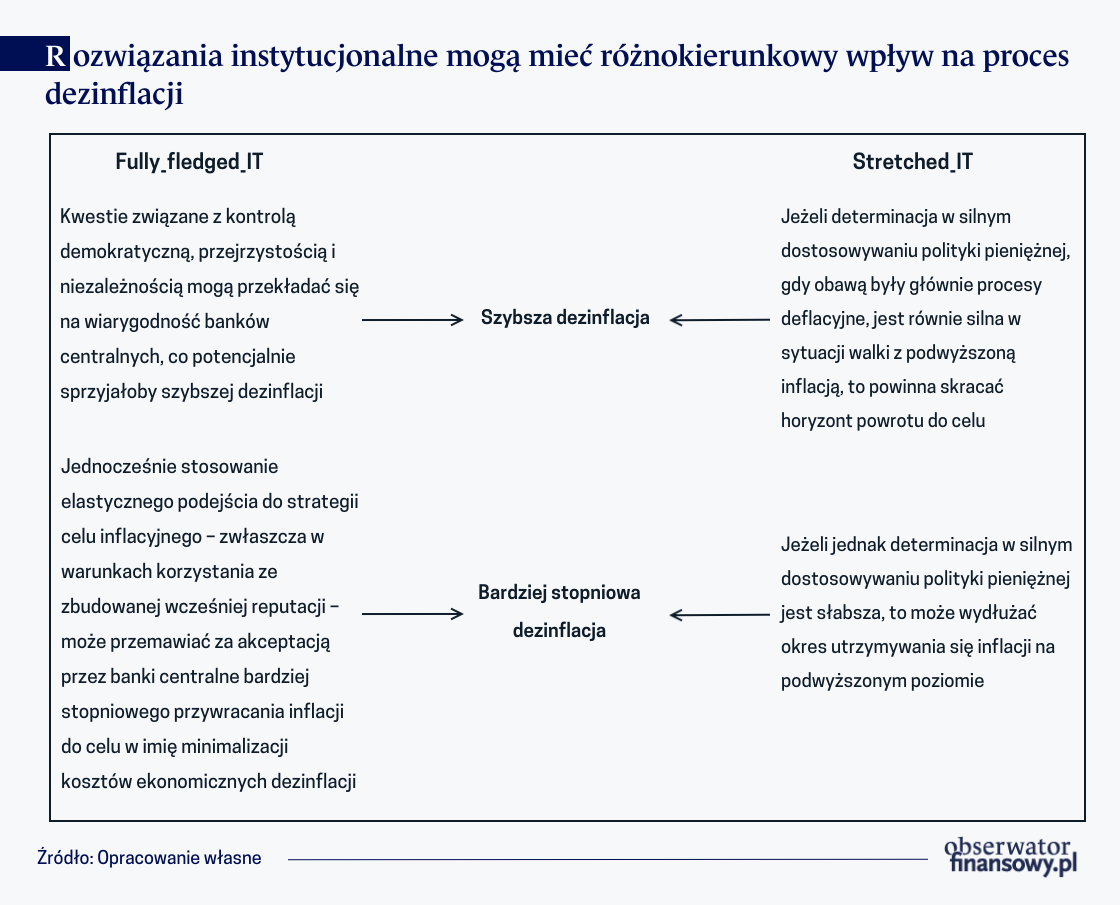 Analiza ilościowa wykazała, że o ile część współczynników korelacji okazała się nieistotna statystycznie, o tyle estymacje modelu ekonometrycznego raczej sugerowały, że banki centralne charakteryzujące się wyższymi wartościami indeksów Fully_fledged_IT oraz Stretched_IT mogą być skłonne stosować bardziej elastyczne podejście do walki z inflacją. Może to oznaczać, że władze monetarne cechujące się większą kontrolą demokratyczną, przejrzystością i niezależnością oraz te zaangażowane w zapewnienie stabilności finansowej lub skłonne do stosowania w czasie kryzysów narzędzi niestandardowych pozwalają na bardziej stopniową dezinflację.