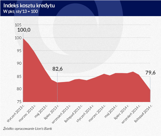 W sukurs tym zmianom idzie też rekordowo niski koszt kredytu hipotecznego przy stabilizacji cen mieszkań. Jak wynika z indeksu, który bada zmiany kosztu kredytu zaciągniętego na zakup przeciętnego mieszkania w dużym mieście, kupując dziś dwa pokoje, trzeba się liczyć z mniejszą miesięczną ratą kredytu niż na początku 2013 r. Wtedy to wspomniane badanie rozpoczęto, a miesięczna rata kredytu zaciągniętego na 50-m. mieszkanie była o 25,6 proc. wyższa niż w odczycie z listopada 2014 r.