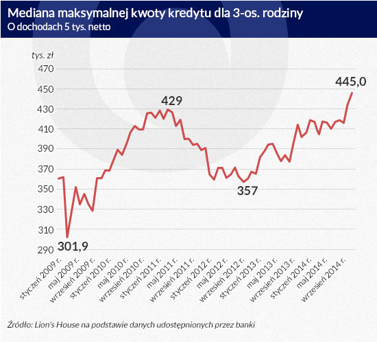 Na tym nie koniec dobrych grudniowych wiadomości. Jak bowiem wynika z ankiety przeprowadzonej przez Lion’s House wśród 18 banków, zdolność kredytowa jest obecnie na najwyższym poziomie w historii. Trzyosobowa rodzina z dochodem w wysokości 5 tys. zł netto miesięcznie może dziś pożyczyć na mieszkanie 445 tys. zł (mediana dla długu zaciąganego na 30 lat). To aż o 43 tys. zł więcej niż w tym samym okresie przed rokiem i o 11 tys. zł więcej niż miesiąc wcześniej. Po raz pierwszy modelowa rodzina mogłaby ponadto liczyć na ponad 0,5 mln zł kredytu mieszkaniowego w aż czterech bankach.