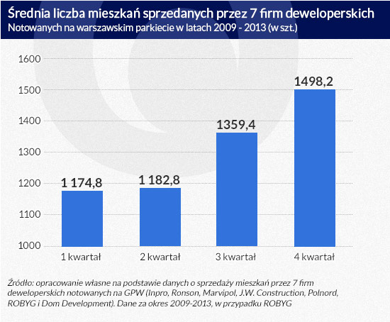 W IV kwartale wyraźnie rośnie liczba mieszkań sprzedawanych przez deweloperów. Potwierdzają to wyniki siedmiu firm deweloperskich notowanych na warszawskim parkiecie. W ostatnich trzech miesiącach roku sugerują one nawet 20-proc. wzrost. Gdyby bowiem uśrednić wyniki sprzedaży badanych firm z ostatnich pięciu lat, to okazałoby się, że na ostatni kwartał przypada po niemal 1,5 tys. podpisanych umów, podczas gdy średnia dla pozostałych kwartałów to poziomie 1239 sztuk kwartalnie. Dzieje się tak, mimo że Boże Narodzenie i pogarszająca się pogoda teoretycznie nie powinny sprzyjać zakupom.
