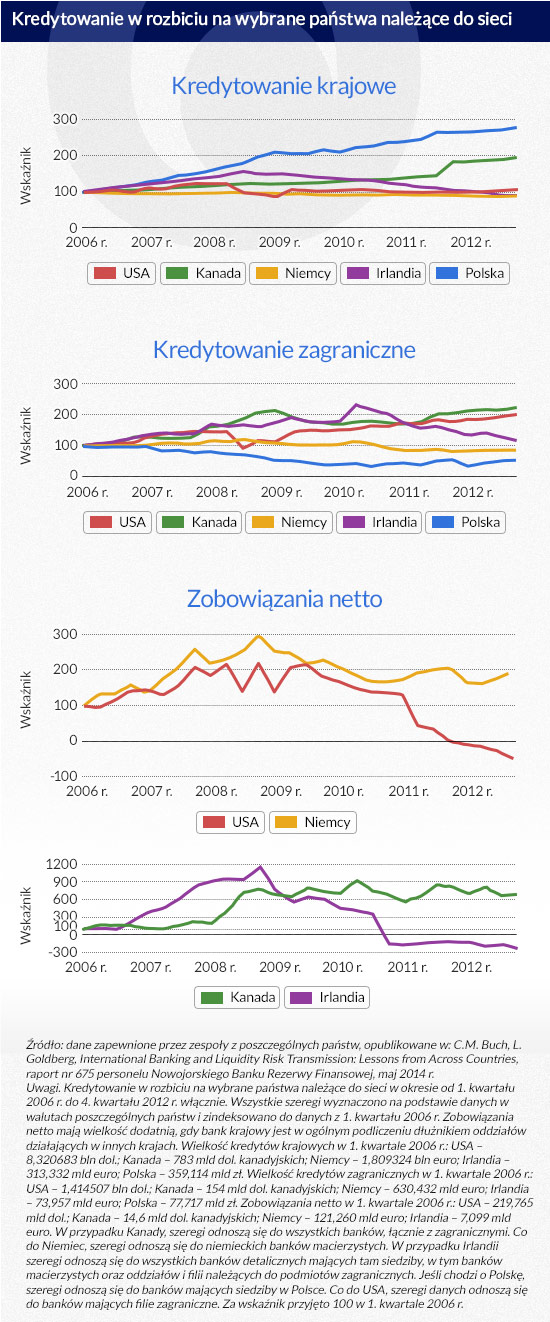 Zamieszczone poniżej wykresy ukazują, że różne kategorie kredytowania – krajowe, zagraniczne i kredyty wewnątrzbankowe netto (to kredyty udzielane oddziałom własnego banku działającym w innych państwach) – przedstawiały się odmiennie w różnych państwach.